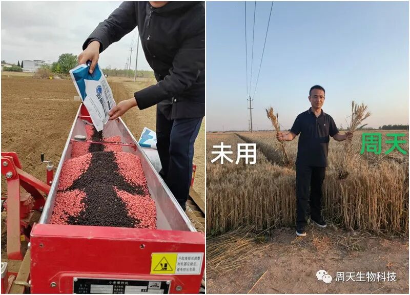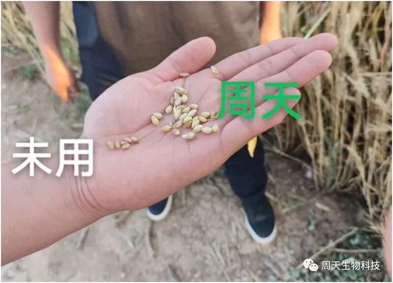 小麦:周天活性氮肥对比某厂家40%复混肥,在亩用量和成本投入相同的情况下,使用周天活性氮肥的地块,小麦长势旺盛,根系发达,茎秆粗壮,穗多穗大,籽粒饱满,出现黑穗现象少,亩增产约300斤。