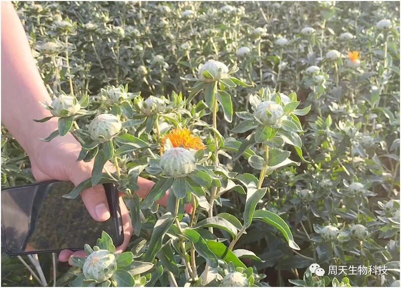 红花:“使用了一袋周天25%复合微生物肥,长的就是不一样,你看这花长的多鲜艳啊,花苞饱满,密密麻麻一大片,今年肯定大丰收。”种植红花的农户开心的给大家介绍着。